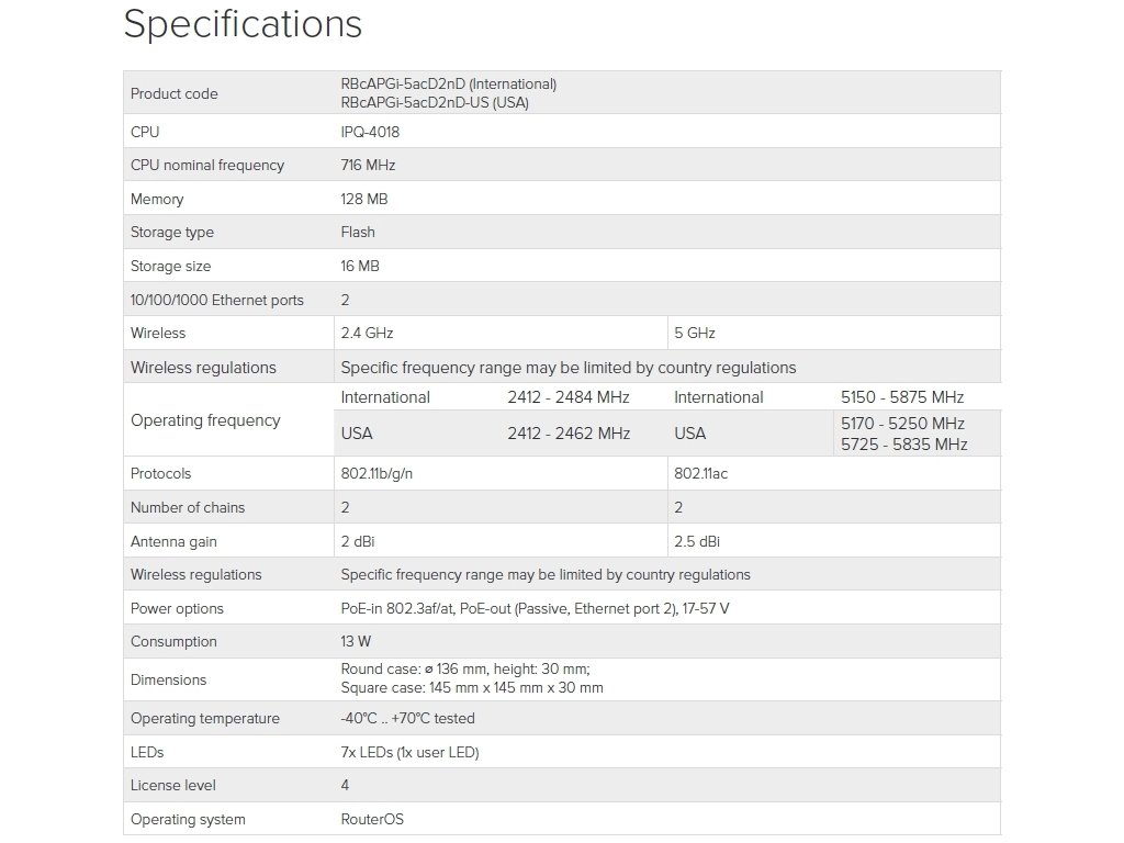Oproti ostatním cAP jednotkám má tento model 2 ethernetové porty s podporou PoE. PoE IN na prvním portu podporuje napájení jak pomocí aktivních norem 802.3af/at, tak i pasivního napájení 17 až 57V DC. Druhý port s funkcí PoE Out může napájet další zařízení se stejným napětím jako na prvním portu, ovšem pouze pomocí pasivního PoE.