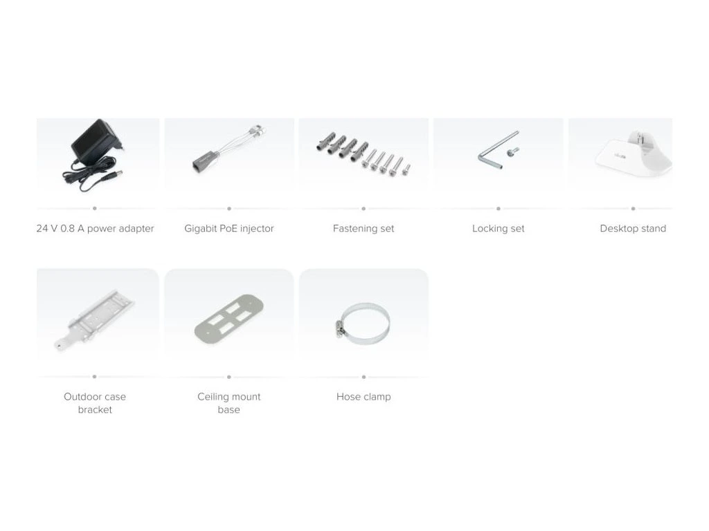 Balení obsahuje gigabitový PoE injektor, napájecí adaptér, sadu šroubů a hmoždinek, zabezpečovací šroub, stojánek na stůl, venkovní držák, držák na strop a svorka.