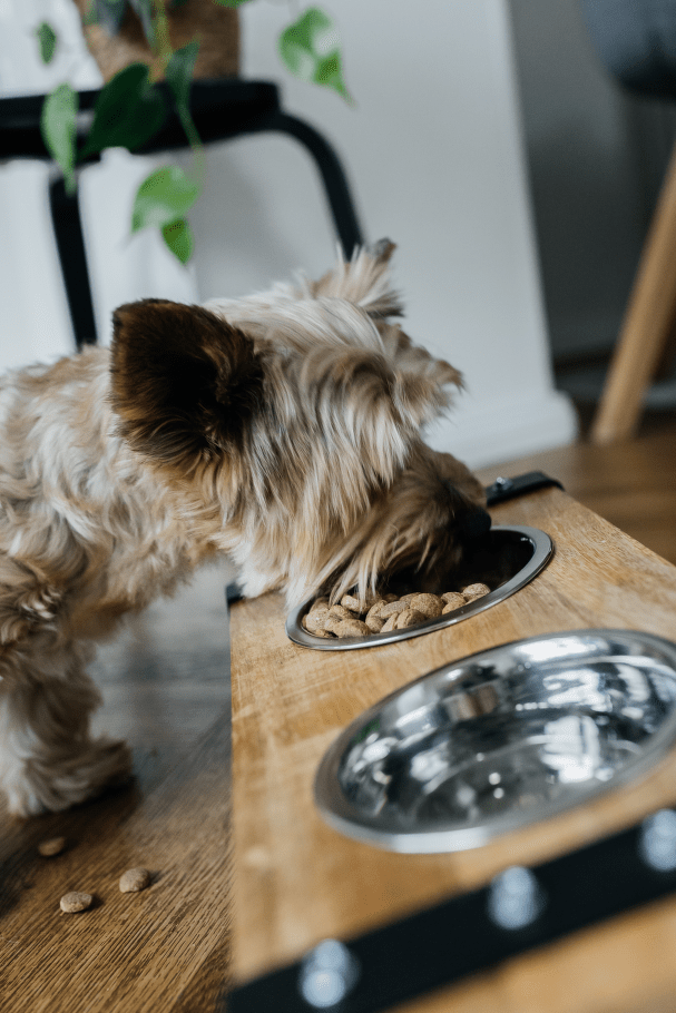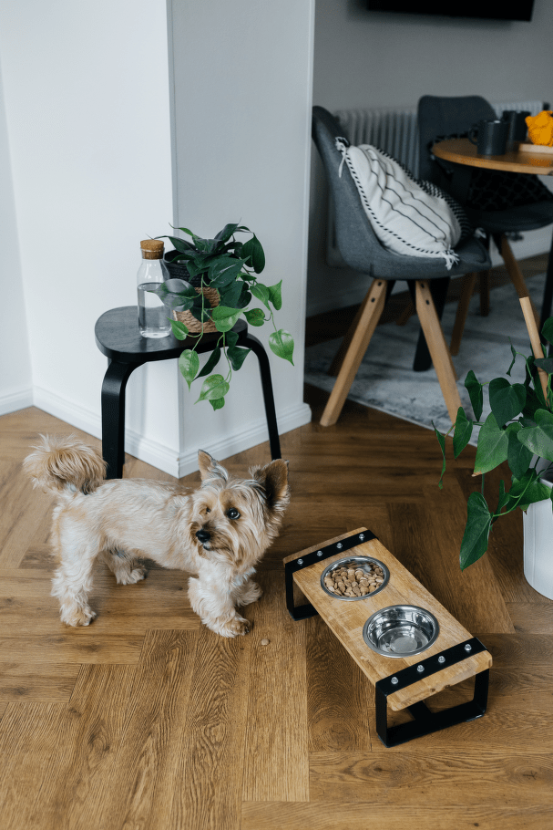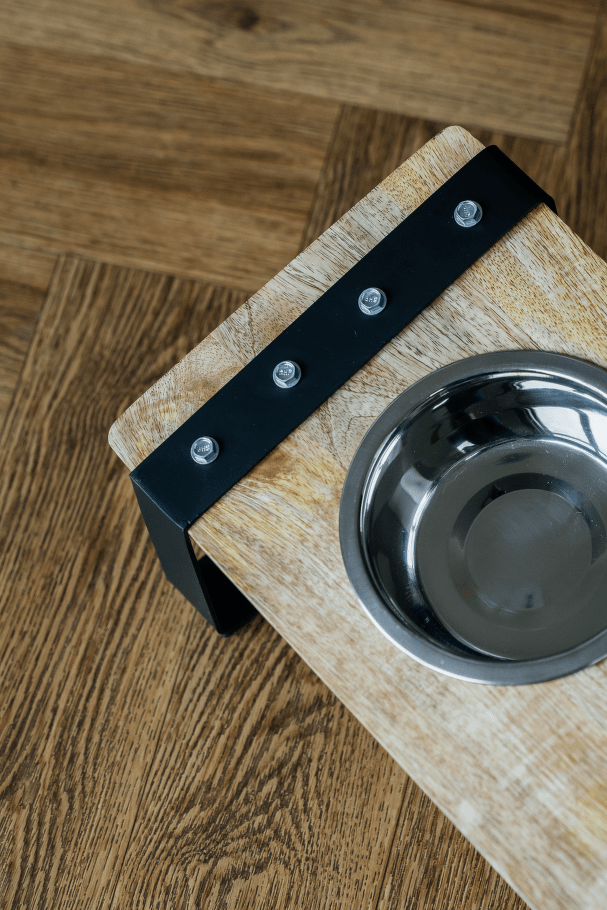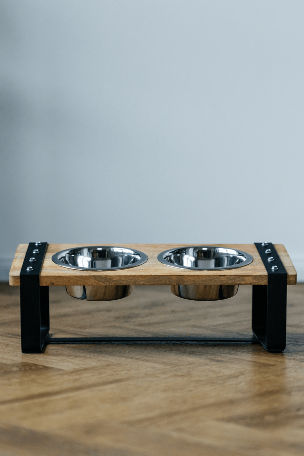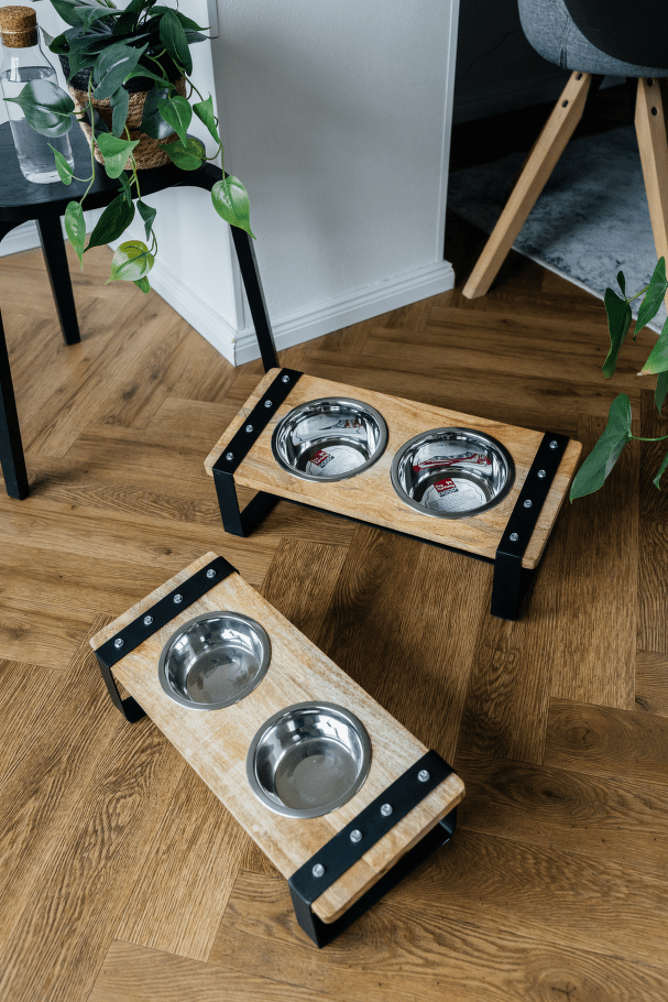 Praktická sada dvou nerezových misek v elegantním dřevěném stojánku s železnou konstrukcí. Ideální řešení pro podávání vody i krmiva, které spojuje funkčnost a moderní design.