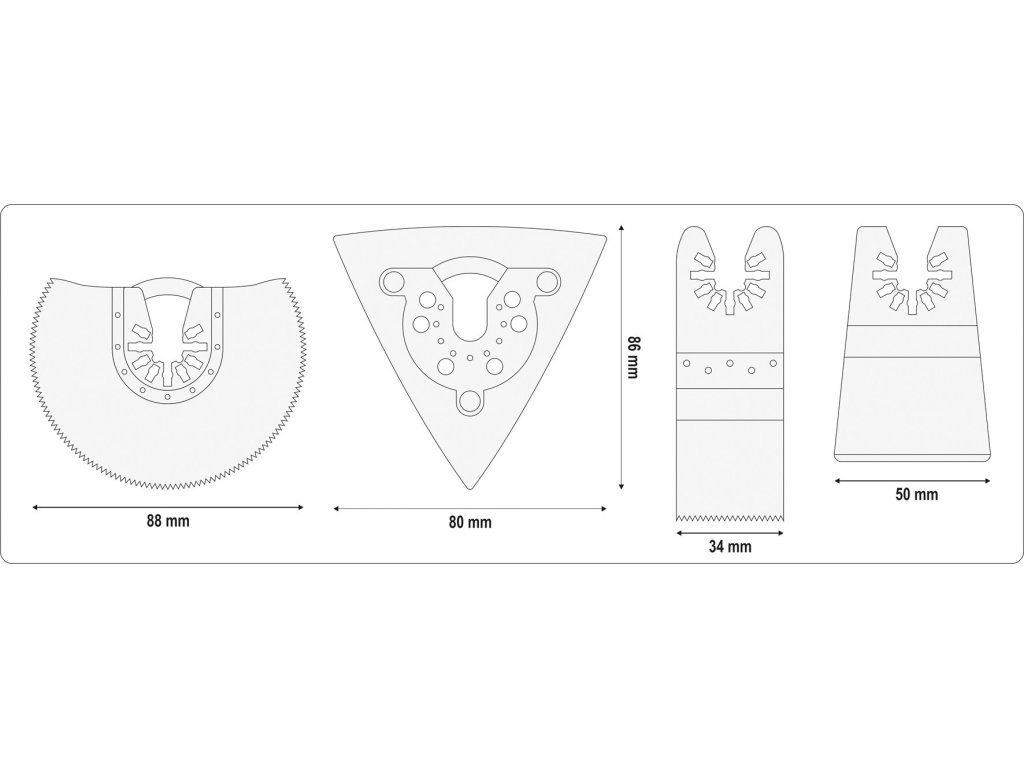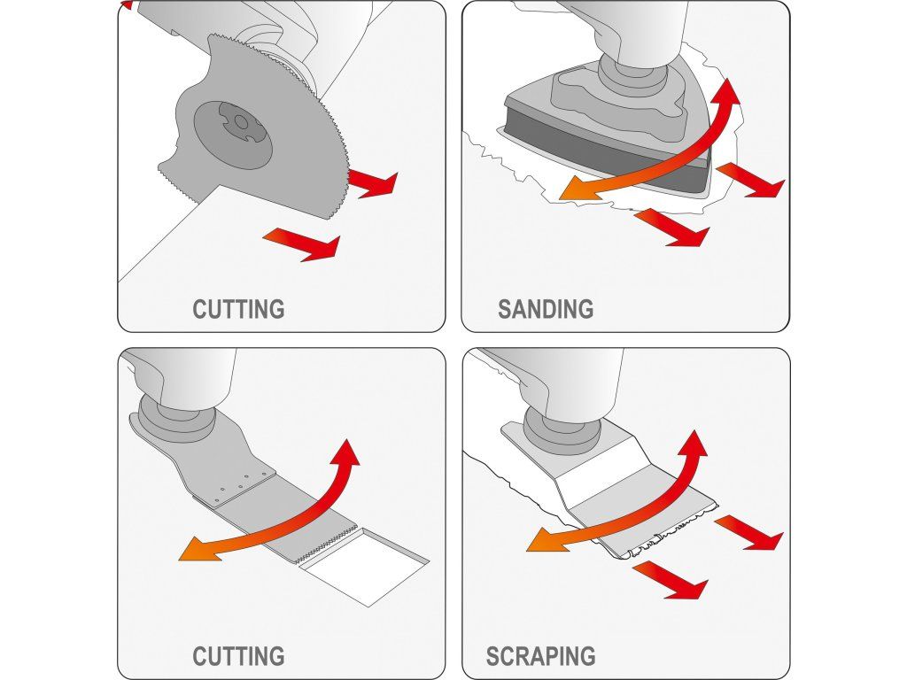 Díky konstrukci je možná rychlá a snadná výměna příslušenství. Sada se skládá ze 2x pilovacích nástavců, nástavce pro řezání a seškrabovacím nástavec pro brusný papír.