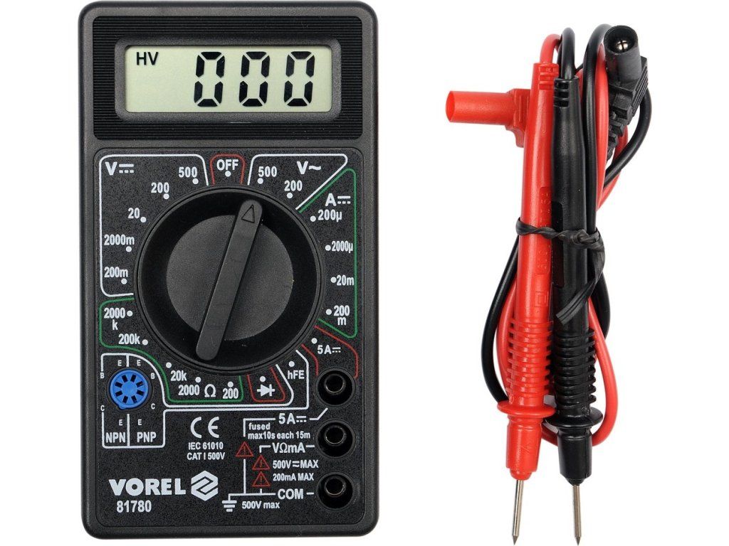 Naměřené hodnoty se zobrazují na přehledném displeji odolného, plastového těla přístroje. K měřiči jsou dále přiloženy kvalitní kabely s měřícími hroty.