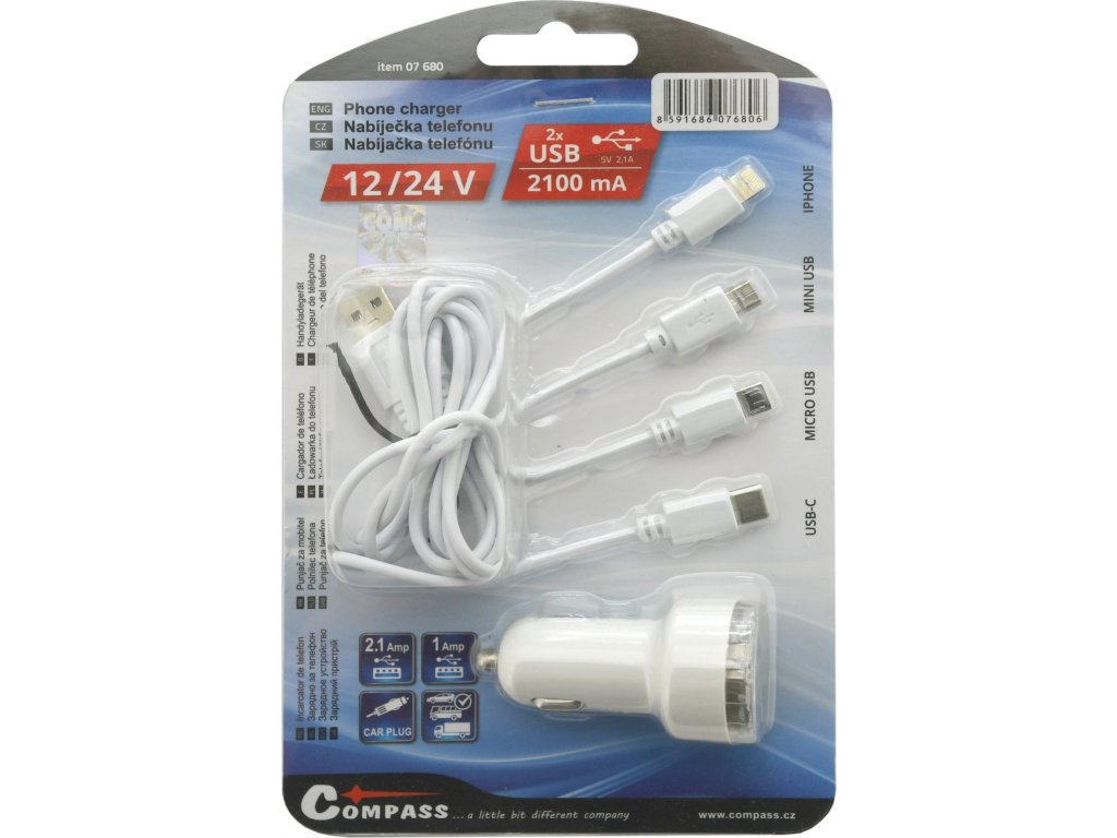 Nabíječka telefonu 12V 2,1A (Iphone, miniUSB, microUSB, USB-C)