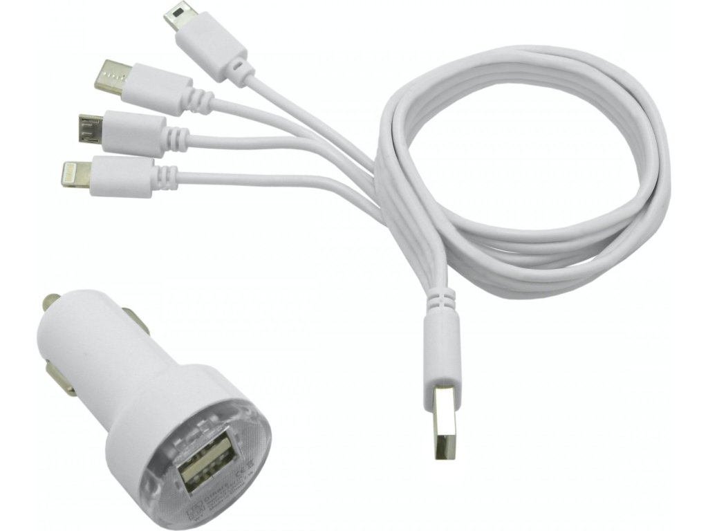 Balení obsahuje USB nabíječku s 12-24V napájením a propojovací kabel s integrovanými konektory (USB-C / Mini USB / Micro USB / iPhone).