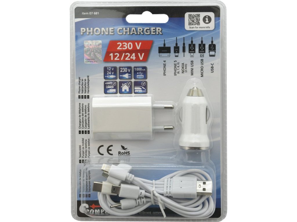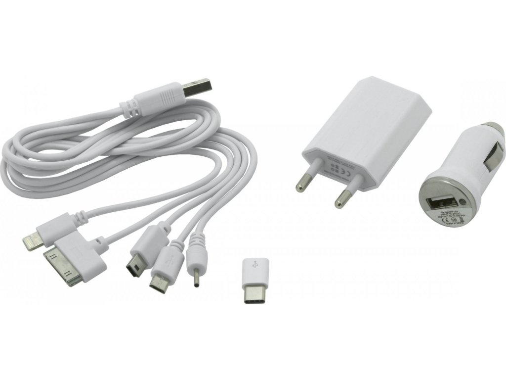 Balení obsahuje USB nabíječku s 12-24V napájením, USB nabíjecí adaptér 230V, propojovací kabel s integrovanými konektory (iPhone 4, iPhone 5-6-7-8-X, Nokia 2 mm, Mini USB a Micro USB s redukcí na USB-C)