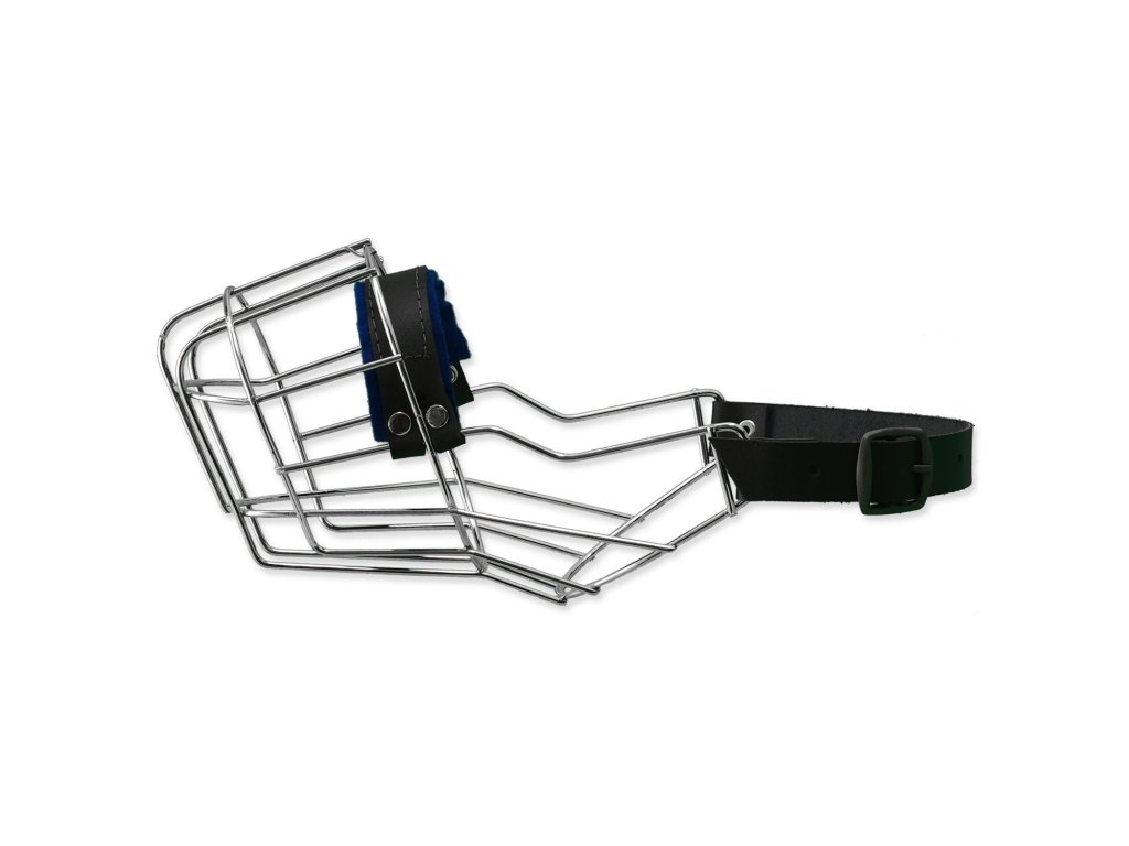 Kovový náhubek s koženými řemínky na zapínání. Vhodný pro fenu kokršpaněla.