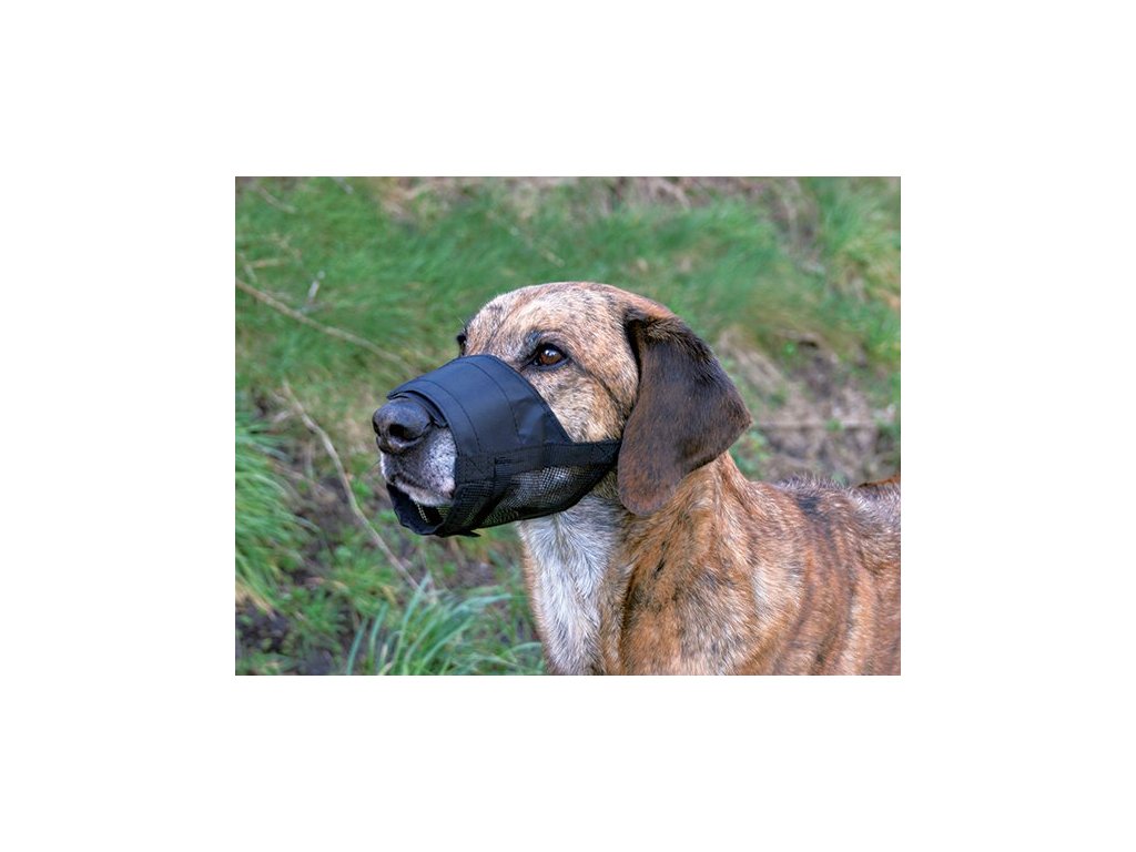 Látkový náhubek pro psy vyrobený z polyesteru. Spodní část je síťovaná pro lepší cirkulaci vzduchu.