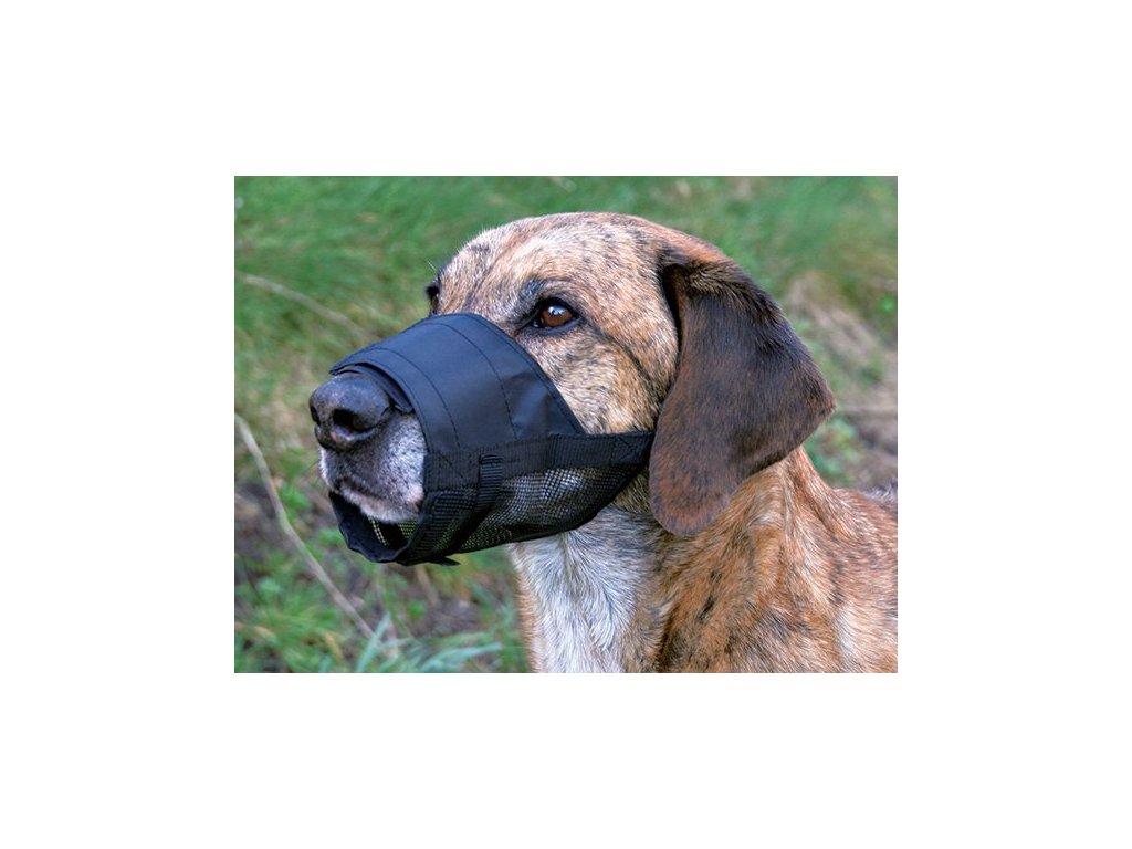 Látkový náhubek pro psy vyrobený z polyesteru. Spodní část je síťovaná pro lepší cirkulaci vzduchu.