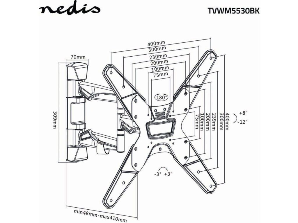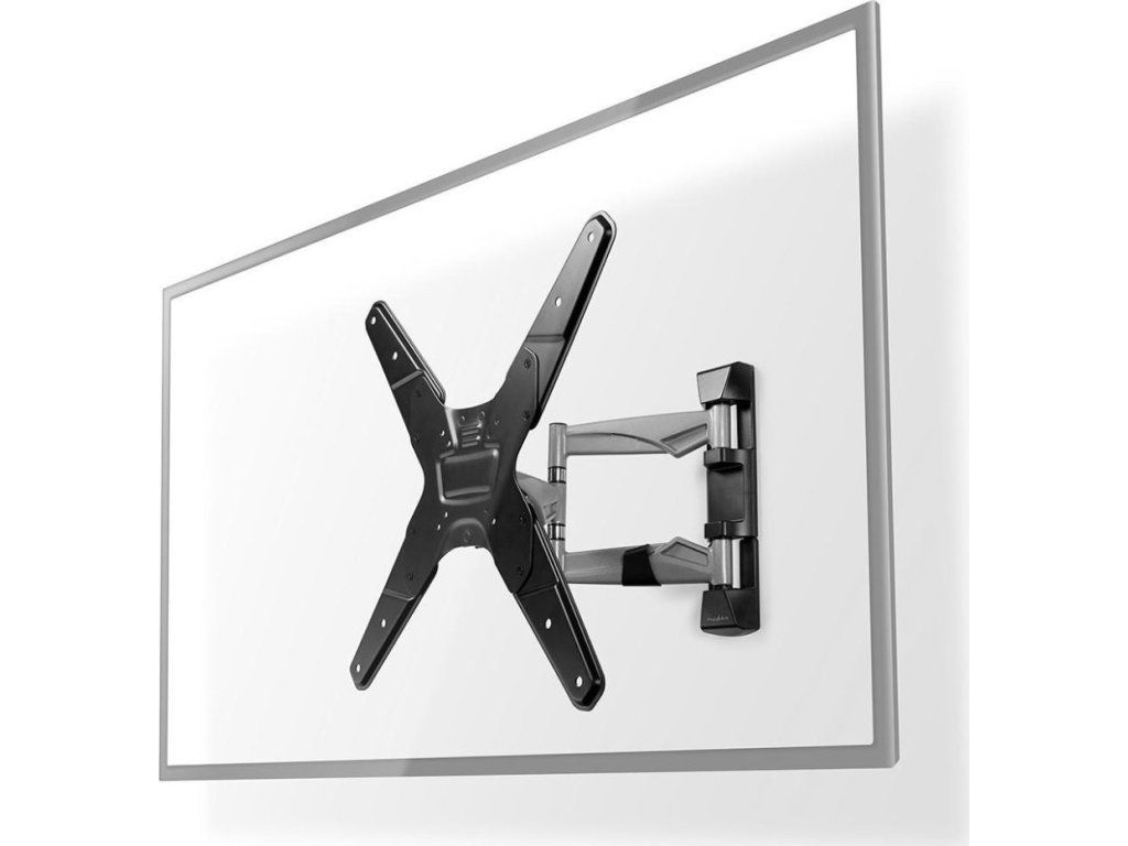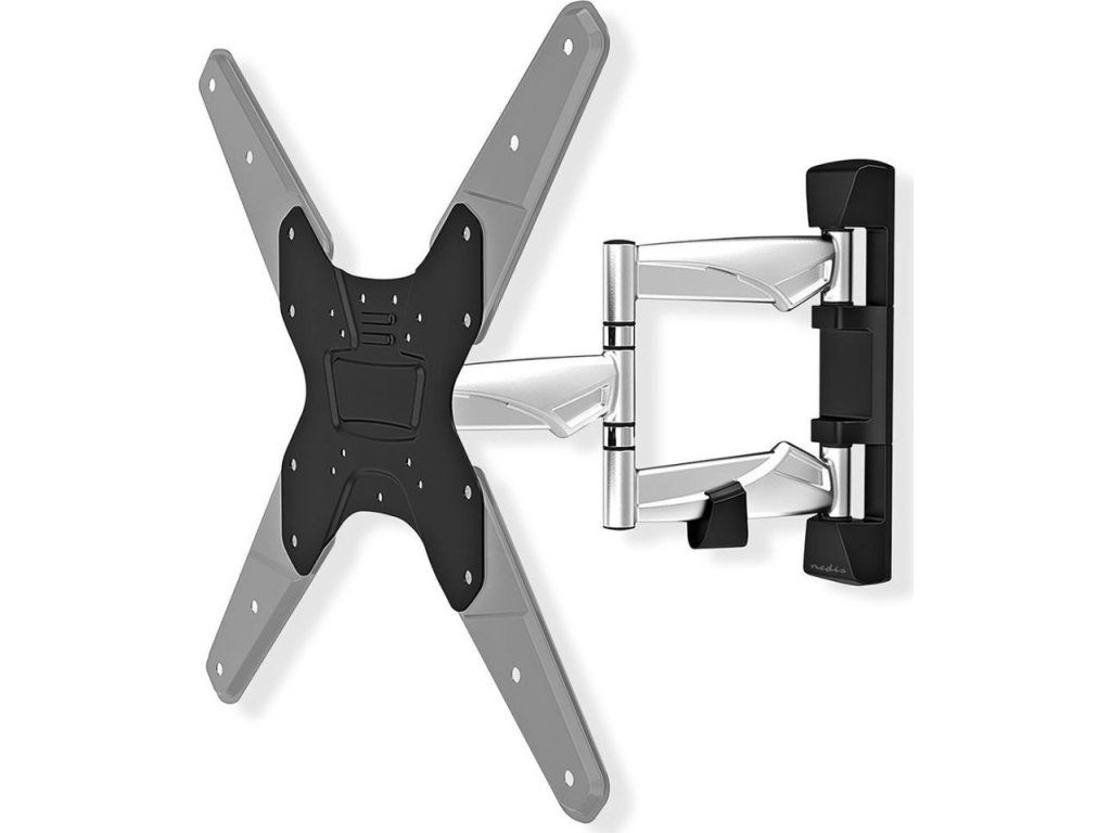Tento profesionální nástěnný držák kombinuje pevnou ocelovou konstrukci s luxusními hliníkovými rameny a nabízí kompletní pohyblivost vašeho televizoru. Díky třem otočným bodům umožňuje otáčení až 180° a nastavení vzdálenosti od stěny v rozsahu 48–410 mm. Držák je vybaven funkcí naklápění o 20° pro optimální pozorovací úhel a vyrovnáváním až o 3° pro perfektní horizontální polohu.
