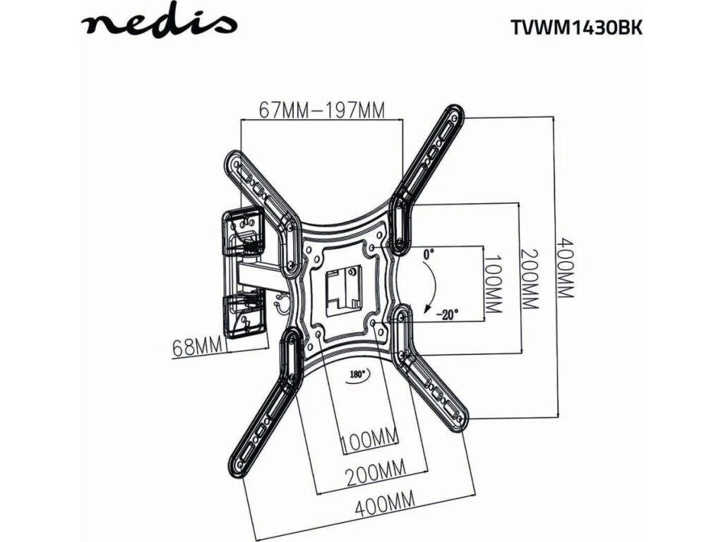 Robustní nástěnný držák umožňuje připevnění televizorů o hmotnosti až 30 kg s možností přesného nastavení polohy pro optimální sledování. Díky dvěma otočným bodům lze televizor otáčet až o 180° a nastavit vzdálenost od zdi v rozsahu 67–197 mm.