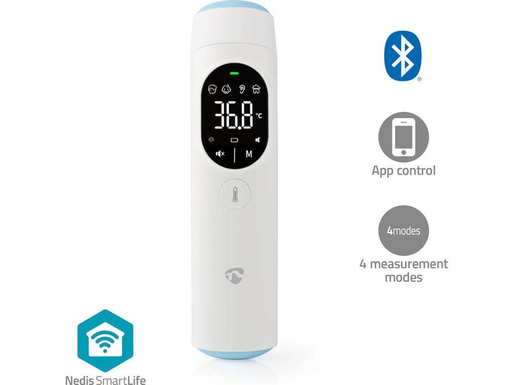Multifunkční infračervený teploměr určený pro měření tělesné teploty přes ucho nebo čelo. Nabízí čtyři režimy měření: teplota čela dospělého, teplota dětského čela, teplota ucha a teplota povrchu předmětu. Stačí jej umístit na čelo, jednou stisknout tlačítko, počkat na zvuk a okamžitě získáte naměřenou hodnotu. Navíc můžete uložit všechna svá měření do aplikace Nedis SmartLife prostřednictvím Bluetooth připojení.