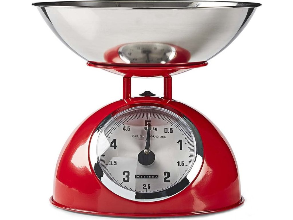 Stylová analogová kuchyňská váha s retro designem a praktickou vyjímatelnou mísou.