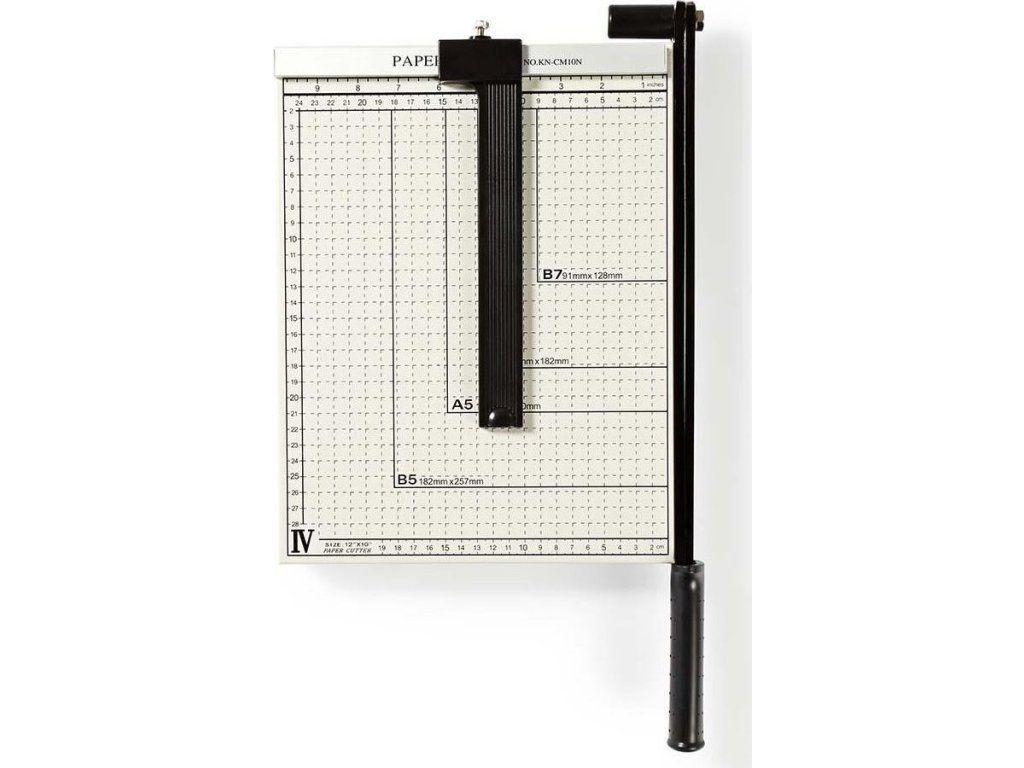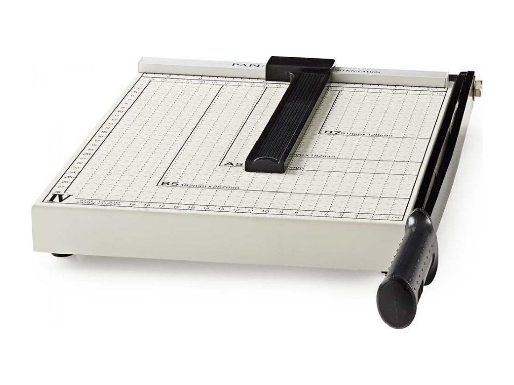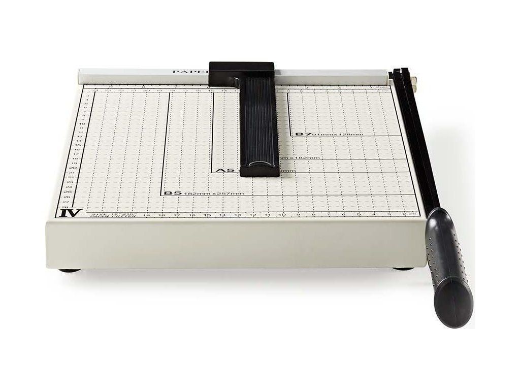 Nedis PACU110A4Řezačka papíru a fotopapíru formátu A4 s bezpečnostním zámkem. Deska o rozměrech 300 × 250 mm disponuje měřítkem v centimetrech i palcích a vyznačenými standardními velikostmi papíru.