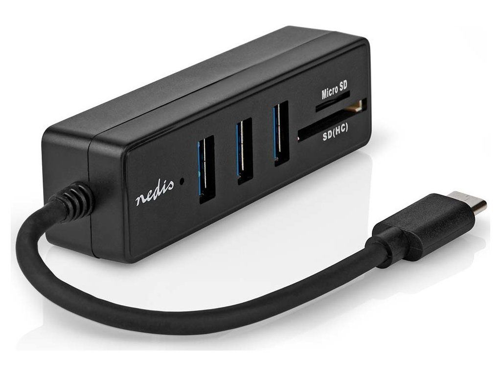 NEDIS USB hub/ zástrčka USB-C zástrčka/ 3x zásuvka USB-A/ 5 Portů/ USB 3.2 Gen 1/ 5 Gbps/ SD & MicroSD/ černý/ blistr