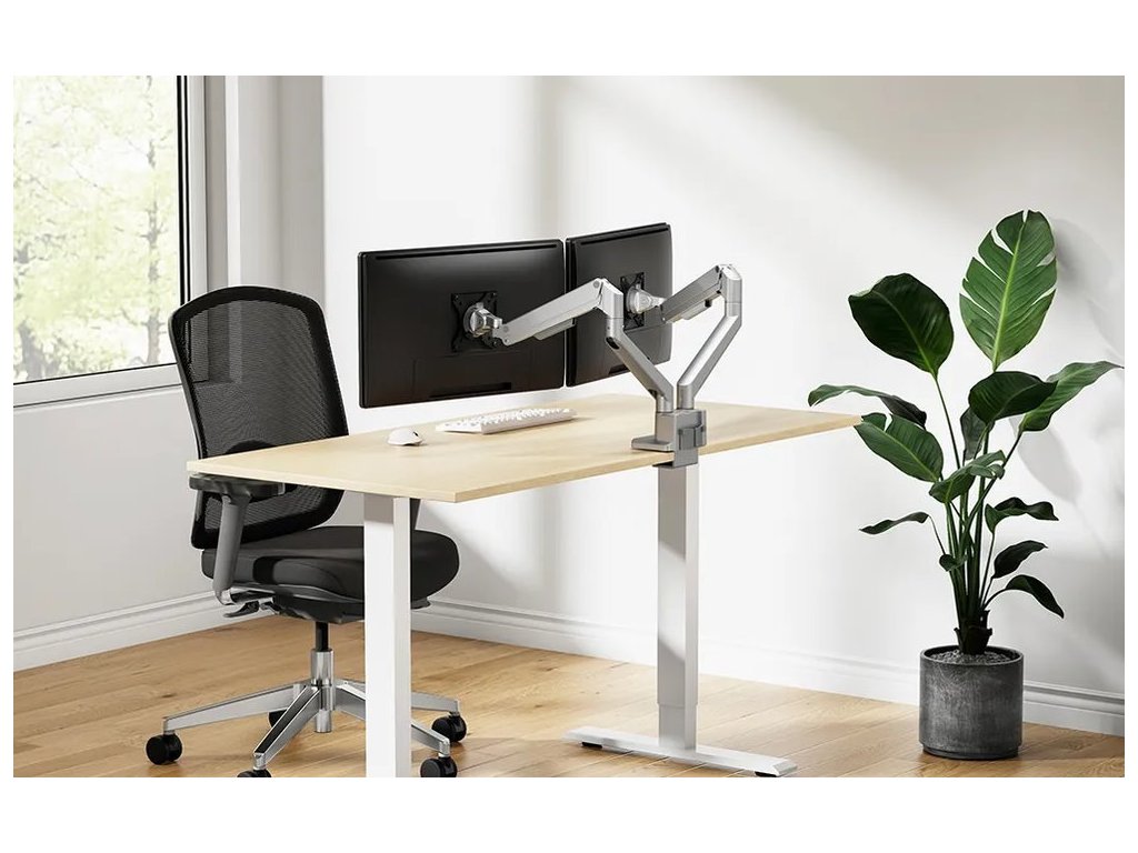 Plně pohyblivý stolní držák pro dva ploché nebo zakřivené monitory s úhlopříčkou 17" až 32" a maximální hmotností 18 kg (2× 9 kg). Všestranná technologie naklápění, otáčení a rotace umožňuje vytvořit optimální pozorovací úhel. Držák má nastavitelnou výšku 21,5–49,5 cm, hloubku 7–52,5 cm a je vhodný pro obrazovky, které odpovídají vzoru otvorů VESA 75 × 75 až 100 × 100 mm. Potěší také systém pro úhledné vedení kabelů. Balení obsahuje stolní svorku i průchodku.