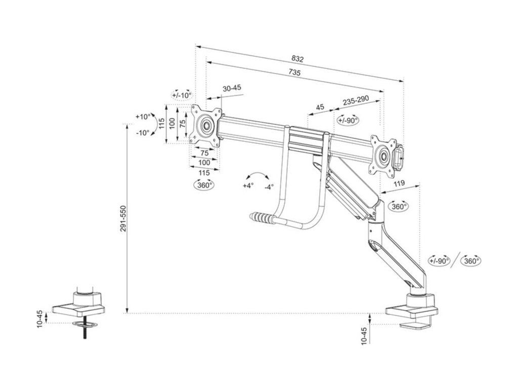 Neomounts DS75-450BL2Flexibilní stolní VESA držák pro 2 ploché monitory o velikosti 17"–32" a maximální nosnosti do 16 kg (2× 8 kg). Univerzální technologie naklápění, otáčení a rotace umožňuje optimální nastavení.