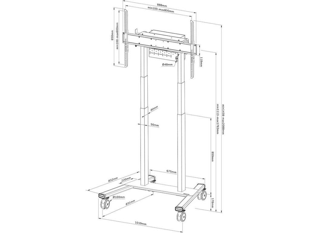 Neomounts FL55-875BL1Mobilní podlahový stojan pro ploché obrazovky s úhlopříčkou od 37" do 100" a hmotností až 110 kg. Nabízí motorizované nastavení výšky (115,2–180,2 cm) pro vytvoření optimálního pozorovacího úhlu. Pro snadný přesun je vybaven rukojeťmi a čtyřmi robustními kolečky o průměru 10 cm. Ve spodní části jsou k dispozici otvory pro uchycení napájecí lišty. Součástí balení je uzamykatelná přihrádka pro počítač s otvorem pro kabely.