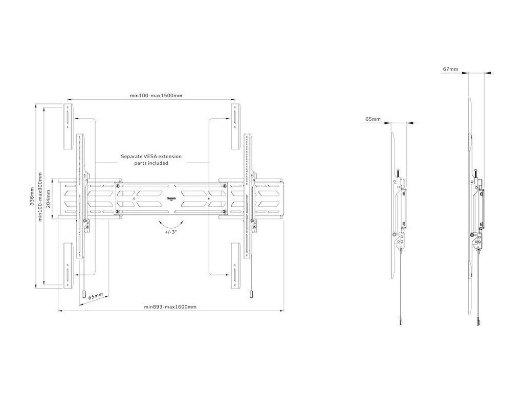 Rozměry VESA: 100 × 100, 100 × 150, 100 × 200, 200 × 100, 200 × 200, 200 × 300, 200 × 400, 300 × 100, 300 × 200, 300 × 300, 300 × 900, 350 × 350, 400 × 200, 400 × 300, 400 × 400, 400 × 500, 400 × 600, 440 × 400, 460 × 640, 500 × 400, 600 × 200, 600 × 300, 600 × 400, 600 × 500, 600 × 600, 680 × 300, 800 × 200, 800 × 400, 800 × 500, 800 × 600, 800 × 800, 900 × 600, 1000 × 400, 1000 × 600, 1000 × 700, 1000 × 800, 1200 × 600, 1200 × 800, 1200 × 900, 1400 × 800, 1500 × 600, 1500 × 900 mm
