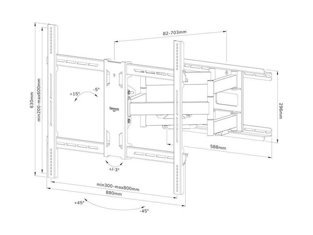 Neomounts WL40S-950BL18Flexibilní nástěnný držák pro ploché obrazovky s úhlopříčkou od 55" do 110" a nosností až 125 kg. Díky technologii náklonu -15° až +5°, úhlu otáčení -45° až +45° a rotaci -3° až +3° umožňuje nastavit ideální úhel pohledu pro sledování obrazovky. Intuitivní systém správy kabeláže minimalizuje nepořádek. Hloubka držáku je snadno nastavitelná od 8,2 do 70 cm. Držák je kompatibilní se standardy VESA 300 × 100 až 800 × 600 mm. Přidanou hodnotou je praktický systém Easy-release pro připevnění televizoru mrknutím oka a samostatná vodováha + upevňovací šablona pro snadnou instalaci.
