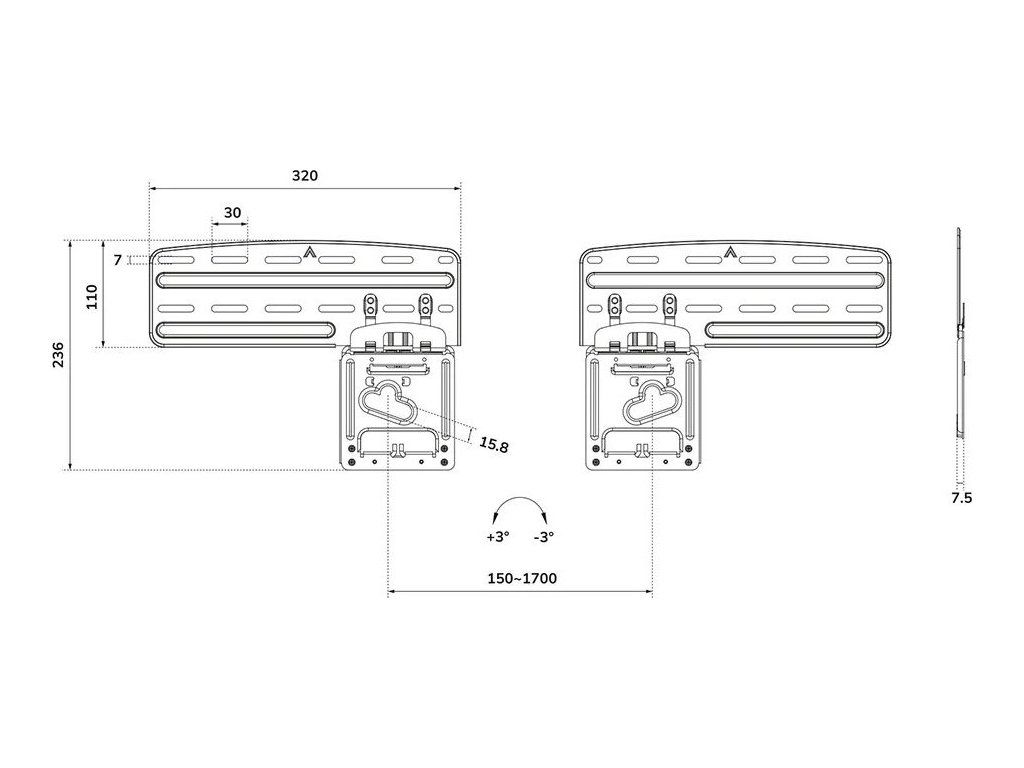 Rozměry VESA: 200 × 100, 200 × 200, 200 × 300, 200 × 400, 300 × 100, 300 × 200, 300 × 300, 300 × 900, 350 × 350, 400 × 200, 400 × 300, 400 × 400, 400 × 500, 400 × 600, 440 × 400, 460 × 640, 500 × 400, 600 × 200, 600 × 300, 600 × 400, 600 × 500, 600 × 600, 680 × 300, 800 × 200, 800 × 400, 800 × 500, 800 × 600, 800 × 800, 900 × 600, 1000 × 400, 1000 × 600, 1000 × 700, 1000 × 800, 1200 × 600, 1200 × 800, 1200 × 900, 1400 × 800, 1500 × 600, 1600 × 600 mm