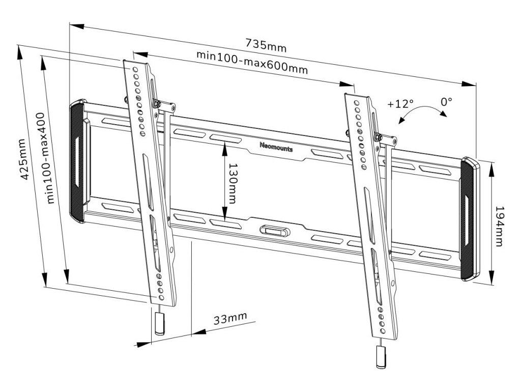 Neomounts WL35-550BL16Naklápěcí nástěnný držák pro ploché obrazovky s úhlopříčkou od 40" do 75" a hmotností až 70 kg. Držák má hloubku 3,3 cm a je vhodný pro obrazovky, které odpovídají vzoru otvorů VESA 100 × 100 až 600 × 400 mm. K dispozici je praktický magnetický systém pro vytažení/uvolnění a integrovaná vodováha, která zajišťuje snadnou instalaci.
