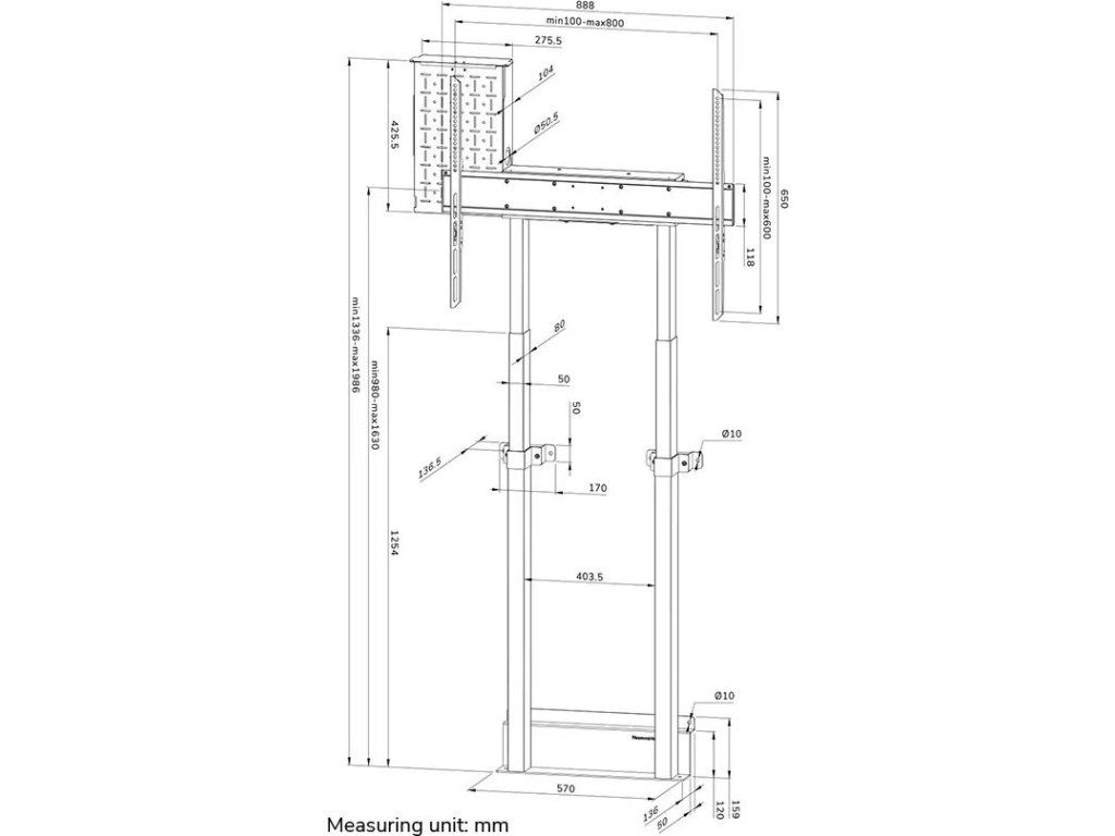 Rozměry VESA: 100 × 100, 100 × 150, 100 × 200, 120 × 120, 200 × 100, 200 × 200, 200 × 300, 200 × 400, 300 × 100, 300 × 200, 300 × 300, 350 × 350, 400 × 200, 400 × 300, 400 × 400, 400 × 500, 400 × 600, 440 × 400, 500 × 400, 600 × 200, 600 × 300, 600 × 400, 600 × 500, 600 × 600, 680 × 300, 800 × 200, 800 × 400, 800 × 500, 800 × 600 mm