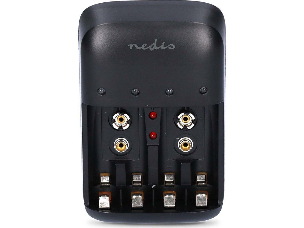 Nedis BACH07Nabíječka až pro čtyři baterie typu AA nebo AAA, nebo až pro dvě baterie 9 V. Na nabíječce se nachází LED indikátor nabíjení.