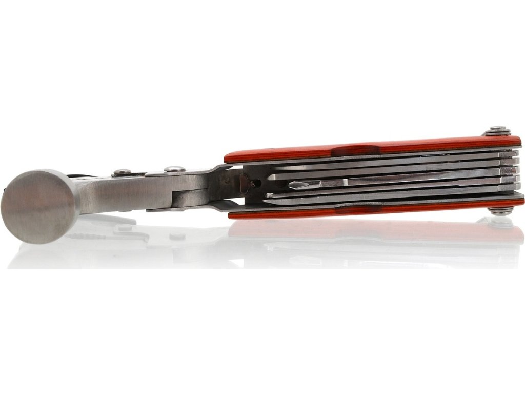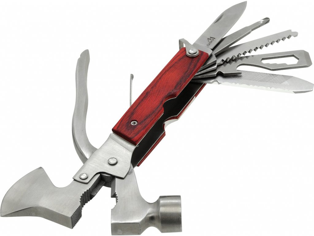 Nejvýraznějšími částmi jsou kladivo a sekyrka. Po rozepnutí pojistky na konci rukojeti, se v přední části odhalí čelisti, které mohou být použity jako kombinované kleště. Dále se nabízí klasický nůž délky 7 cm, křížový šroubovák nejběžnějších rozměrů, pilka na dřevo, odstraňovač šupin ryb a pilníkem se zakončením, jenž se dá použít jako plochý šroubobvák. Posledním nástrojem je otvírák, kombinovaný imbusovým nástavcem.