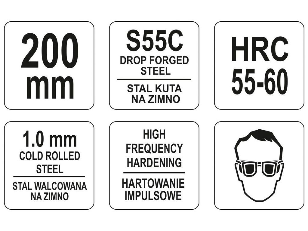 Zhotovené z S55C oceli 55-60 HRC. Oplastované rukpojeti zabezpečují míru komfortu při práci.