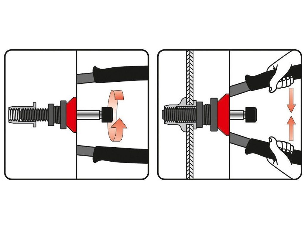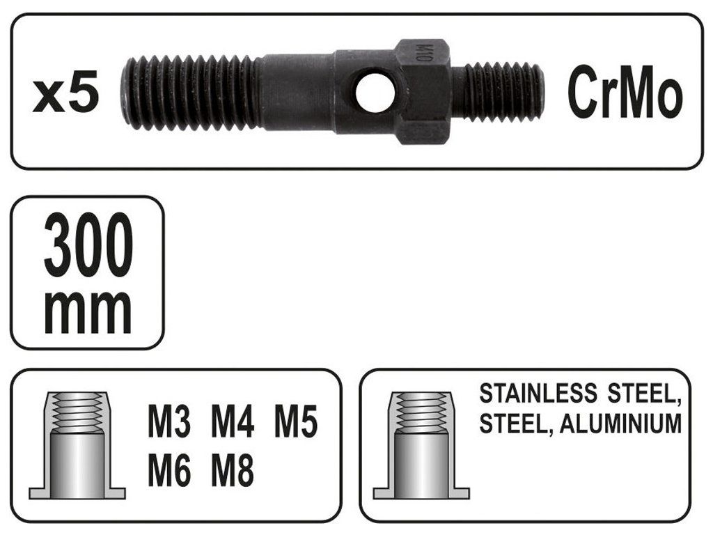Délka kleští 300 mm, bytelné kovové tělo s gumovými rukojeťmi s precizně opracovanými hlavicemi z nástrojové CrMo oceli. Jsou určeny pro nýty M3 - M8 z nerezové oceli, nebo hliníku.