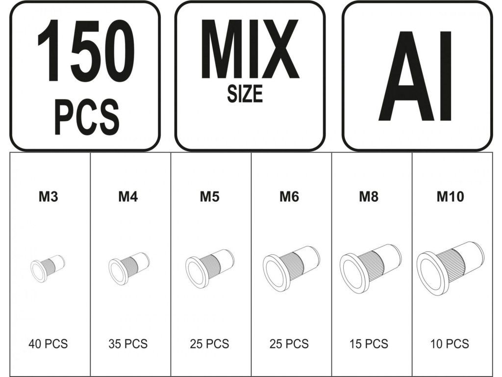 Nýtovací matice hliníková sada150 ks M3-M10