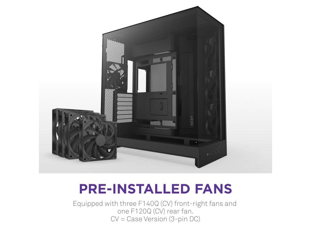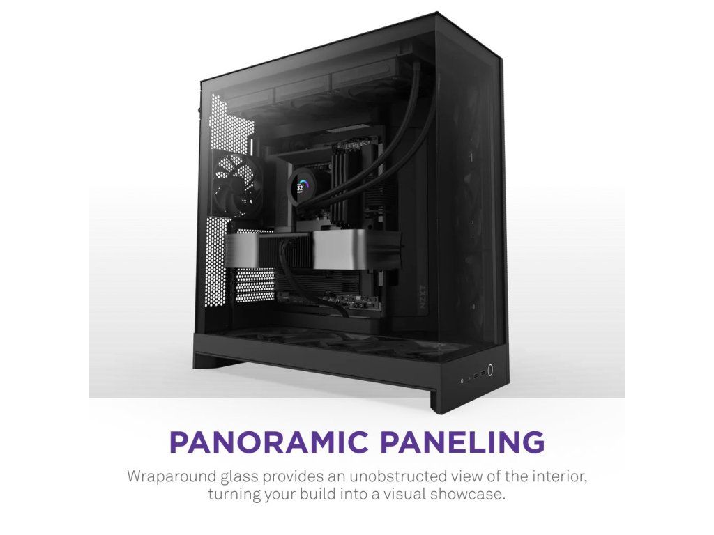 NZXT H9 Flow představuje stylovou počítačovou skříň ve formátu Middle Tower, která je navržena tak, aby poskytovala bohaté možnosti chlazení a vysoký výkon GPU. Rozsáhlé tepelné schopnosti umožňují instalovat celkem až 10 ventilátorů, přičemž 4 už jsou osazeny v základu. PC skříň NZXT H9 Flow se vyznačuje unikátním designem s nepřerušovaným skleněným panelem. Díky tomu vám poskytuje jasný vhled do interiéru.