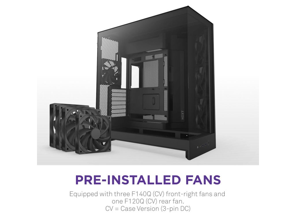 - Předinstalované ventilátory: Obsahuje tři ventilátory F140Q (CV) v přední pravé části a jeden ventilátor F120Q (CV) v zadní části.