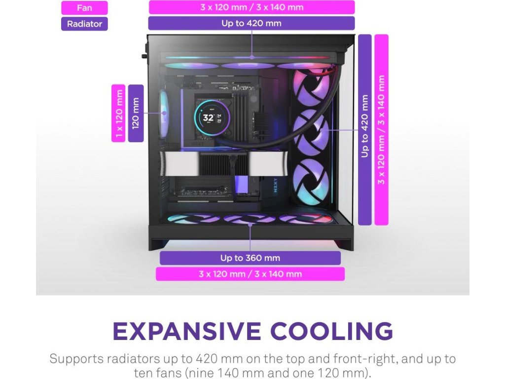 - Připraveno pro RGB: Obsahuje dva ventilátory F420 RGB Core, jeden ventilátor F120 RGB Core (CV) v zadní části a NZXT Control Hub.