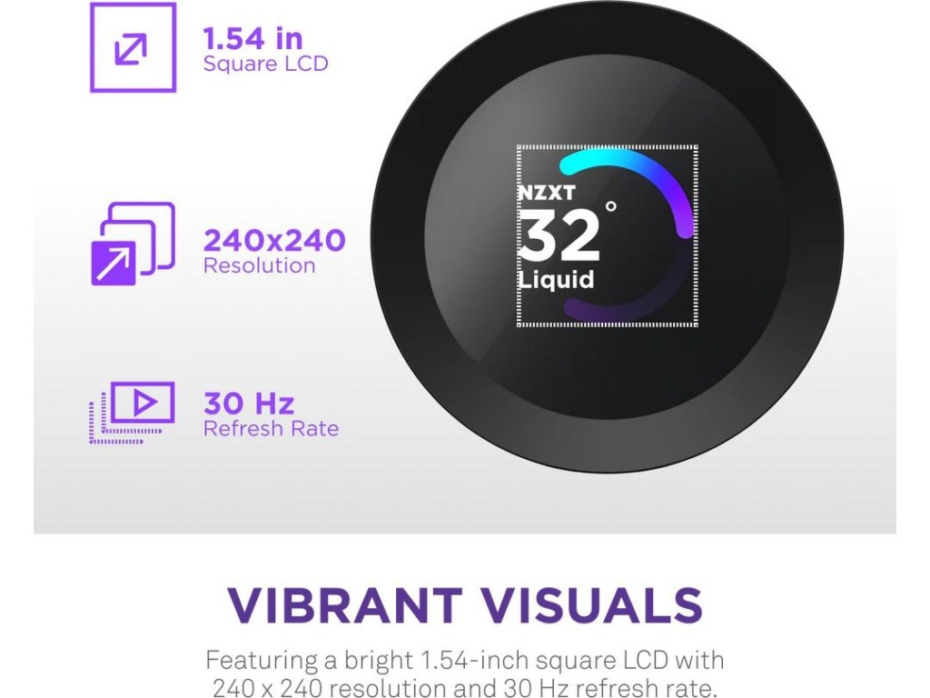 Jasný 1,54" LCD displej s rozlišením 240 × 240 pixelů a jasem 300 cd/m² umožňuje zobrazit systémové teploty v reálném čase, animované GIFy nebo vlastní obrázky. Pomocí softwaru NZXT CAM můžete také integrovat webové služby jako Spotify nebo YouTube.
