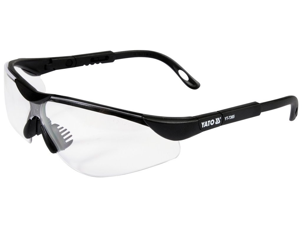 Ochranné brýle z polykarbonátu, s délkově nastavitelnými ramínky, které lze navíc pomocí otvorů na koncích opatřit např. gumičkou pro zavěšení na krk.