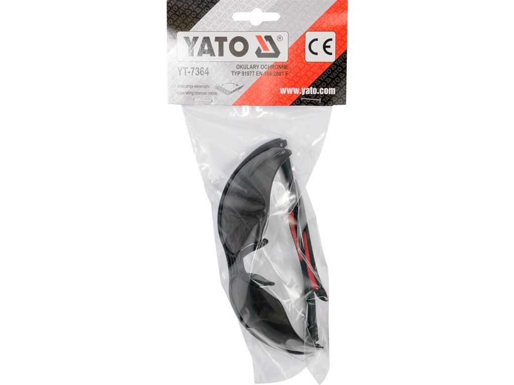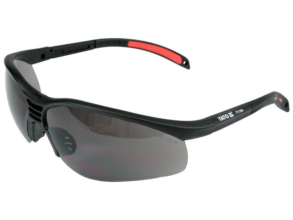 Tmavé ochranné brýle z polykarbonátu, s délkově nastavitelnými ramínky, které lze navíc pomocí otvorů na koncích opatřit např. gumičkou pro zavěšení na krk. Dosedací plochy s obličejem jsou pro pohodlnější nošení polstrované.