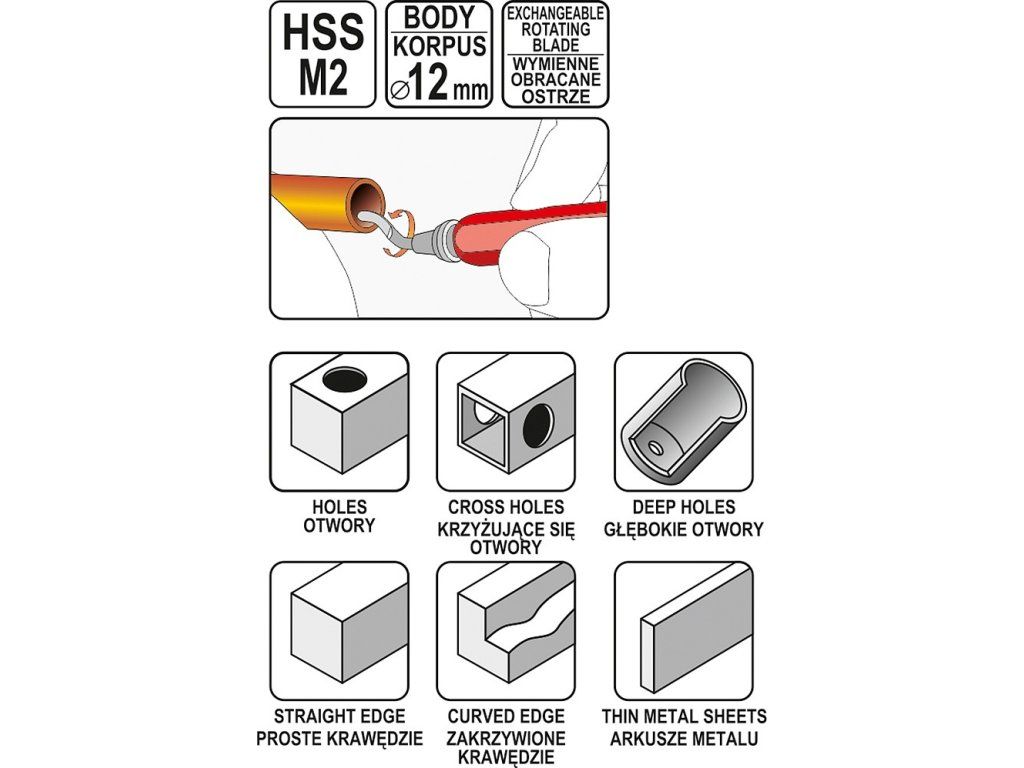 Ruční odhrotovávací nástroj s rotačním nožem z rychlořezné oceli.