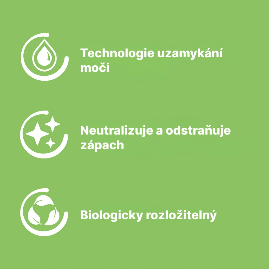 Speciální granule okamžitě uzavírají moč uvnitř a brání šíření pachu. -