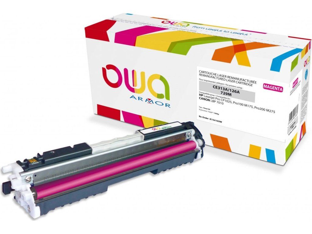 Alternativní toner OWA ARMOR s označením K15410OW je určen pro tiskárny značky Hewlett Packard a je kompatibilní s tonery No.126A. Kapacita tohoto purpurového toneru je až 1200 stran při standardním 5% pokrytí.