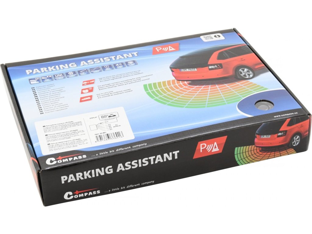 Balení obsahuje displej, řídící jednotku, 4 senzory pro montáž do zadního nárazníku, odpovídající kabeláž a vrták odpovídajícího průměru.