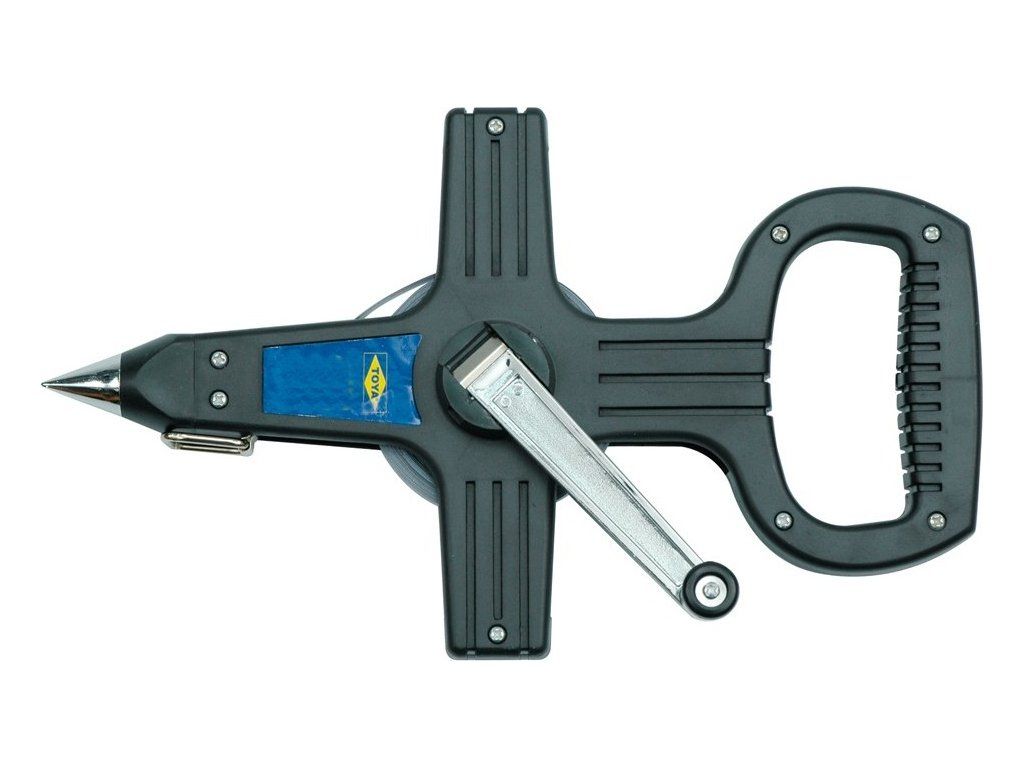 Otevřené pouzdro z plastu s klikou na svinování a ostrým hrotem pro nastavení míry do země.