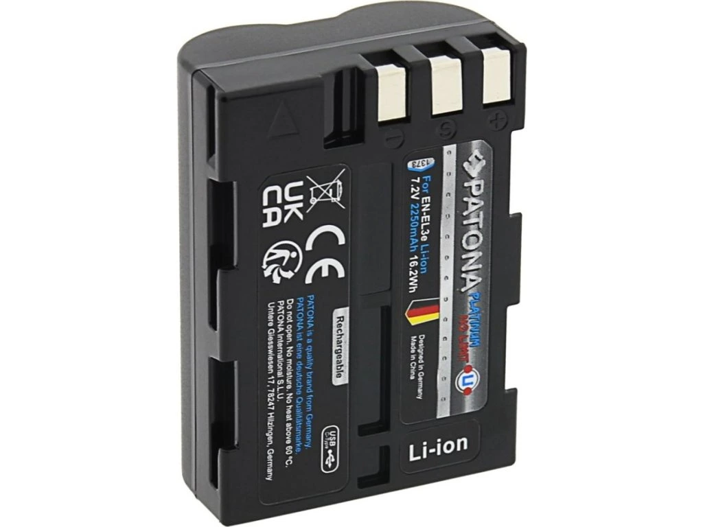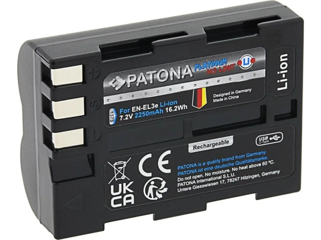 PATONA PLATINUM kompatibilní s Nikon EN-EL3EKompatibilní baterie pro fotoaparáty Nikon. Baterie se vyznačují vysokou kvalitou, mají integrovanou ochranu proti přetížení, přebití a přehřívání. Nabíjení baterie je realizováno skrze zabudovaný konektor USB-C. Lze ji nabíjet připojením kabelu do USB-C konektoru (např. z počítače, powerbanky či nabíječkou na mobilní telefon) tak i v klasické nabíječce na Li-ion. Nabíjecí proud max. 1,2 A (vyšší vstupní proudy jsou automaticky redukovány pomocí IC ovládání baterie).