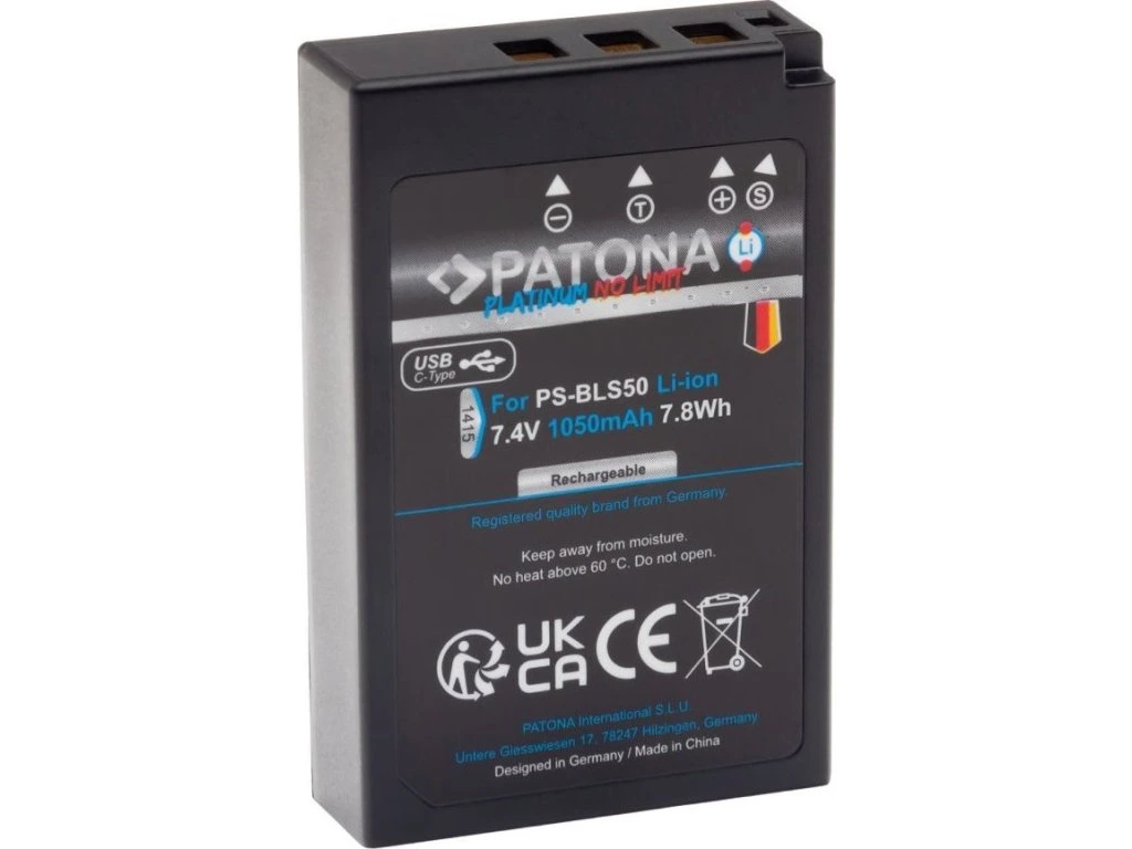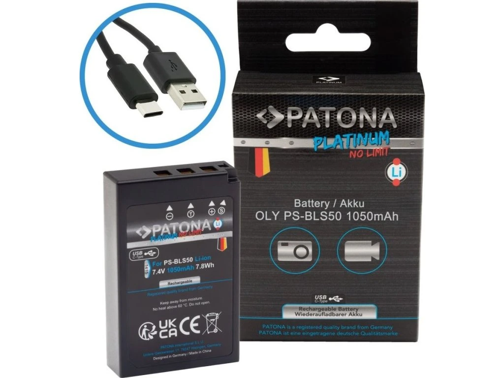PATONA PLATINUM kompatibilní s Olympus BLS-5/BLS5Kompatibilní baterie pro fotoaparáty Olympus. Baterie se vyznačují vysokou kvalitou, mají integrovanou ochranu proti přetížení, přebití a přehřívání. Nabíjení baterie je realizováno skrze zabudovaný konektor USB-C. Lze ji nabíjet připojením kabelu do USB-C konektoru (např. z počítače, powerbanky či nabíječkou na mobilní telefon) tak i v klasické nabíječce na Li-ion. Nabíjecí proud max. 1,2 A (vyšší vstupní proudy jsou automaticky redukovány pomocí IC ovládání baterie).