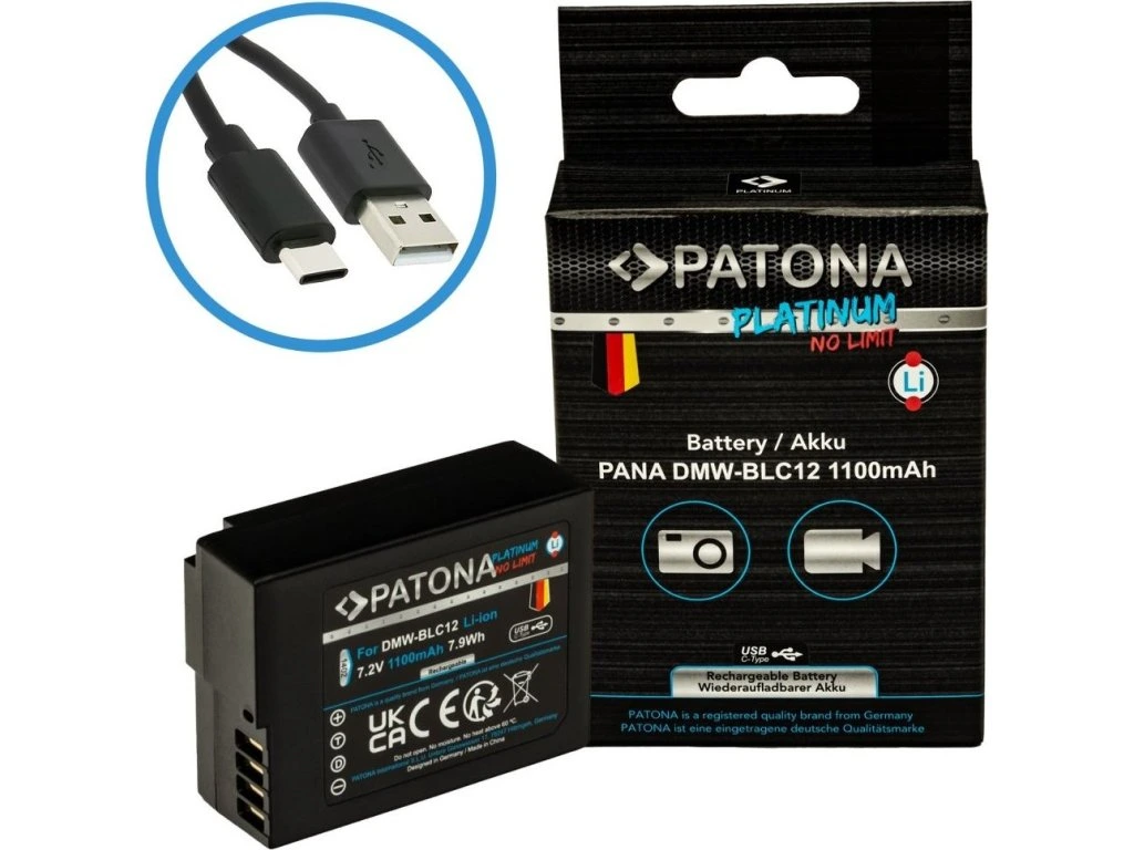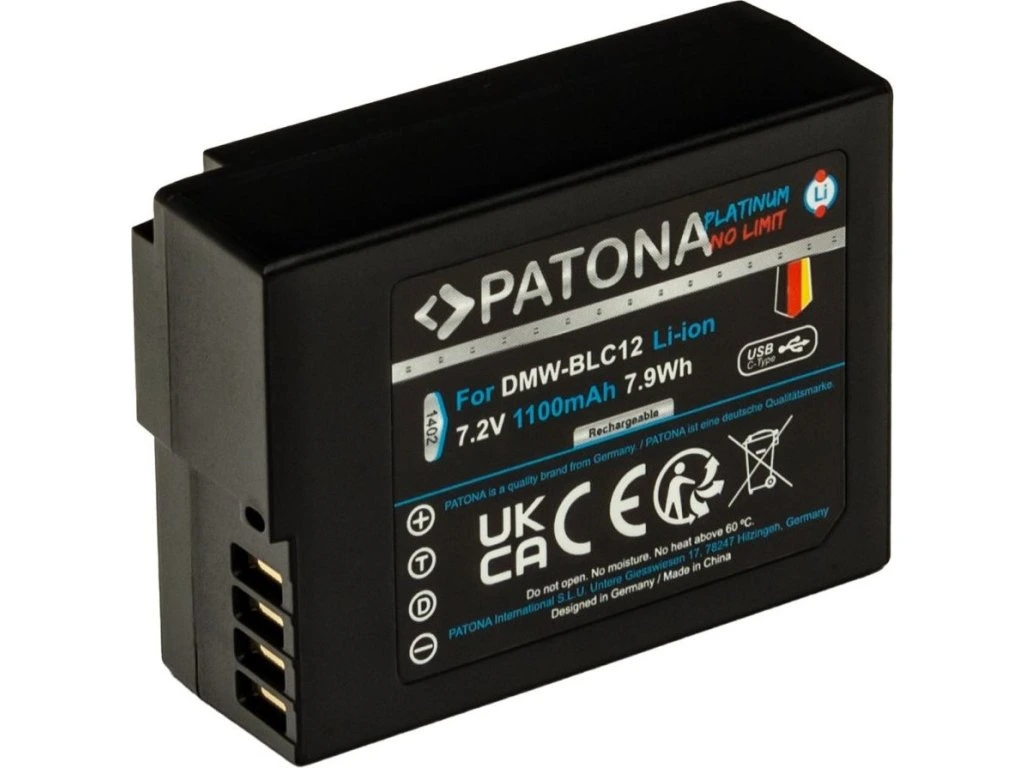 PATONA PLATINUM kompatibilní s Panasonic DMW-BLC12Kompatibilní baterie pro fotoaparáty Panasonic. Baterie se vyznačují vysokou kvalitou, mají integrovanou ochranu proti přetížení, přebití a přehřívání. Nabíjení baterie je realizováno skrze zabudovaný konektor USB-C. Lze ji nabíjet připojením kabelu do USB-C konektoru (např. z počítače, powerbanky či nabíječkou na mobilní telefon) tak i v klasické nabíječce na Li-ion. Nabíjecí proud max. 1,2 A (vyšší vstupní proudy jsou automaticky redukovány pomocí IC ovládání baterie).