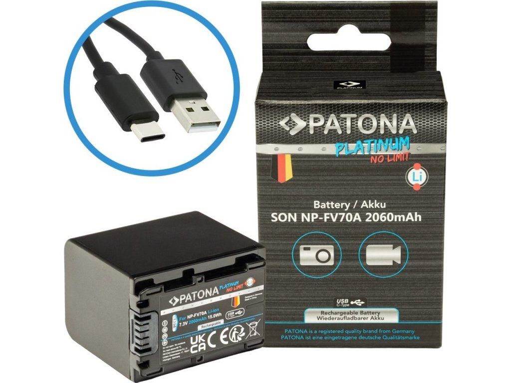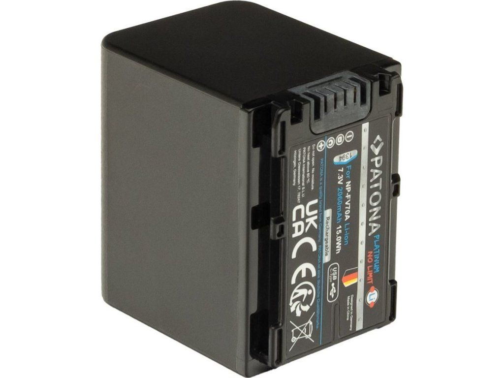 PATONA PLATINUM kompatibilní se Sony NP-FV70AKompatibilní baterie pro fotoaparáty Sony. Baterie se vyznačují vysokou kvalitou, mají integrovanou ochranu proti přetížení, přebití a přehřívání. Nabíjení baterie je realizováno skrze zabudovaný konektor USB-C. Lze ji nabíjet připojením kabelu do USB-C konektoru (např. z počítače, powerbanky či nabíječkou na mobilní telefon) tak i v klasické nabíječce na Li-ion. Nabíjecí proud max. 1,2 A (vyšší vstupní proudy jsou automaticky redukovány pomocí IC ovládání baterie).