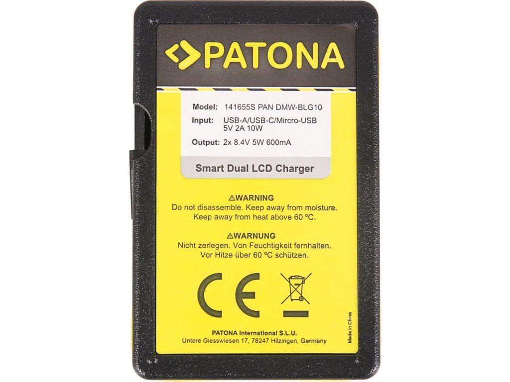 PATONA pro 2 baterie Panasonic DMW-BLG10S nabíječkou Patona DUAL lze nabíjet současně 2 baterie najednou, bez ohledu na to, zda mají obě baterie stejnou kapacitu. Na LCD se zobrazuje aktuální stav nabití baterie. Nabíječky jsou vyráběny dle nejvyšších evropských standardů kvality a vyznačují se extrémně dlouhou životností. Nabíječku lze napájet skrze micro USB, USB-A či USB-C port.