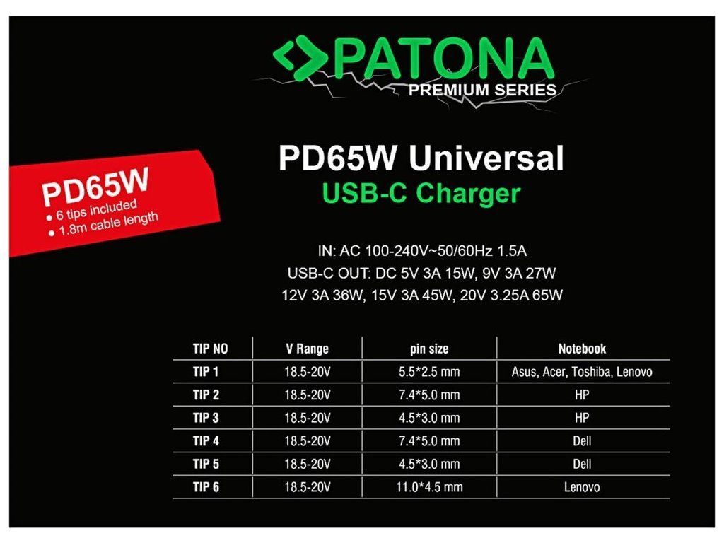 PATONA napájecí adaptér k ntb/ 18,5-20V 65W/ 6 konektorů/ UNI/ USB-C/ Power delivery