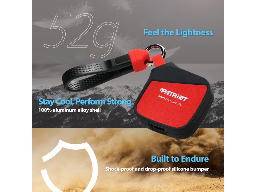 Díky kompaktní rozměrům je SSD Patriot PDP31 snadno přenosné, ve vnějším prostředí jej chrání silikonový rám, který absorbuje případné otřesy nebo pády, což z něj dělá perfektní volbu na cesty. Vnější plášť je zhotoven z kvalitní hliníkové slitiny, která se podílí na chlazení a zabraňuje přehřátí při náročném a dlouhodobém provozu. S kapacitou 1 TB a rozhraním USB-C 3.2 Gen2 je ideálním úložištěm pro smartphony, tablety, počítače Mac, PC i herní konzole.