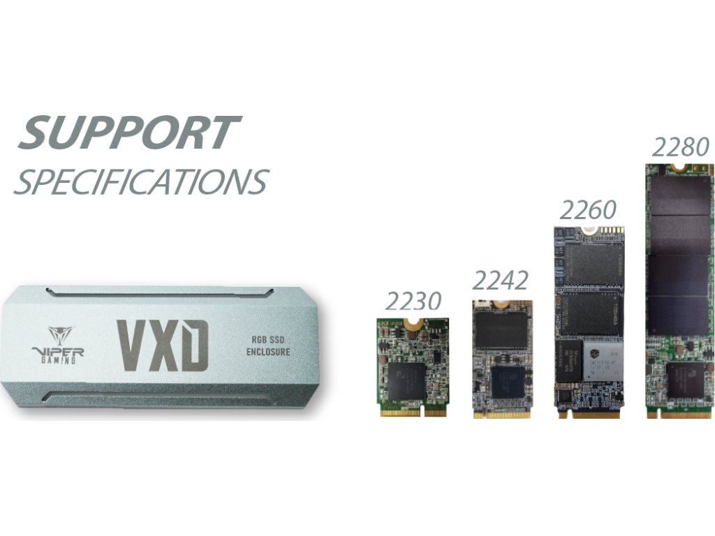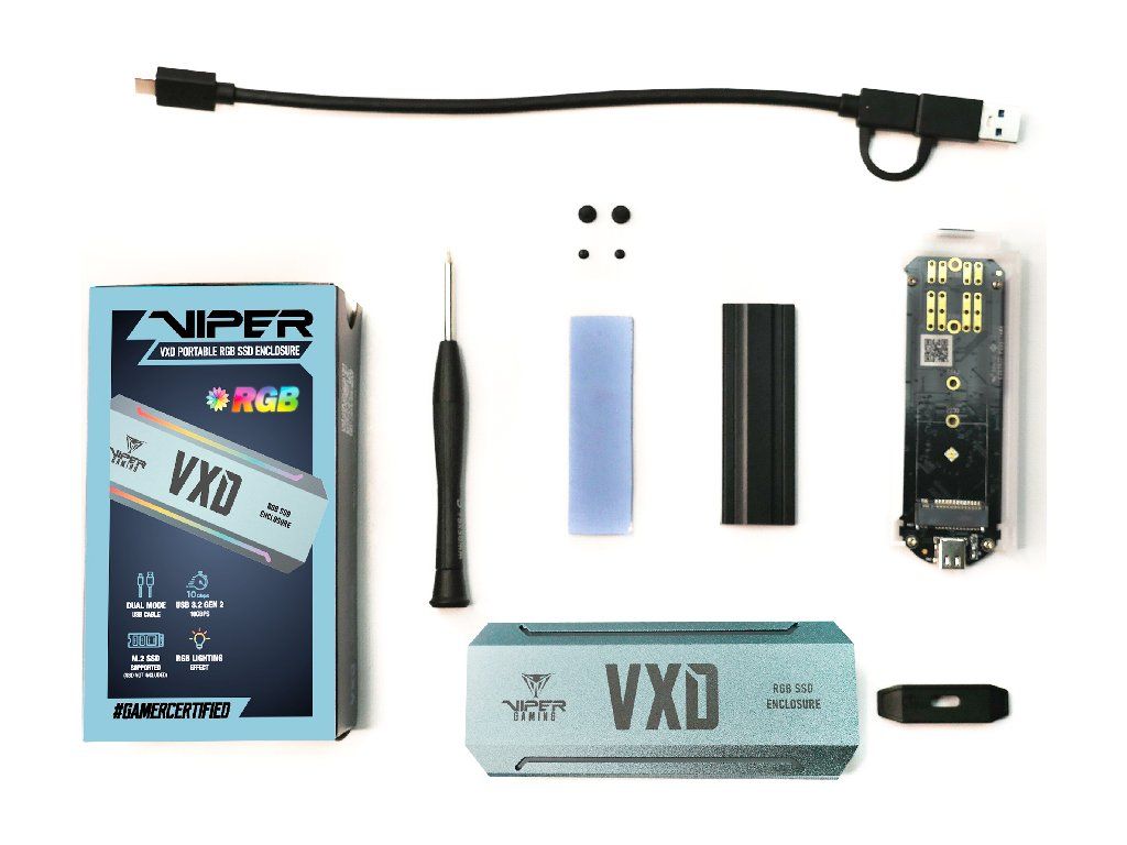 Patriot Viper VXD M.2 PCIe RGB SSD EnclosureExterní RGB box pro připojení M.2 NVMe disku k vašemu PC, notebooku, TV či jinému multimediálnímu zařízení pomocí konektoru USB-C, přes který je zároveň i napájen. Rozhraní PCIe Gen3 x4 optimalizované pro M.2 (2230/2242/2260/2280) s velikostí disků od 120 GB do 4 TB. Hliníkové tělo boxu zajistí velmi dobré chlazení vloženého disku.