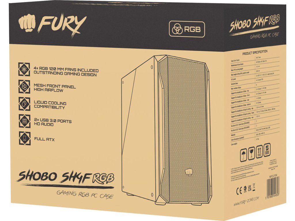 Podívejte se na Fury Shobo SH4F RGB - chytrou počítačovou skříň s účinným chlazením a RGB podsvícením. Skříň Shobo SH4F RGB je kompatibilní se základními deskami ATX a systémy vodního chlazení (AIO 360/280/240/140/120), je vybavena až 4 ventilátory RGB, síťovanou přední částí a ochranou proti prachu. Ať je světlo!